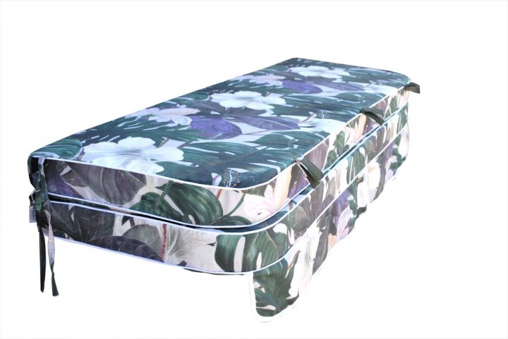 Этот комплект предназначен для уличных качелей, имеющих длину сидения 170 см. Данный матрас изготовлен из универсальной смешанной ткани, которая изготавливалась в Испании. В состав данной ткани входит 70% хлопка, а также 30% полиэстера. В этой ткани большое содержание натуральных волокон, благодаря этому она с лёгкостью пропускает воздух и достаточно приятная тактильно. Эта ткань не мнётся, она устойчивая к внешним воздействиям. На матрасе есть специальная молния, благодаря этому чехол с лёгкостью можно снять и постирать. Для того, чтобы матрас было удобнее крепить к качелям, есть специальные пучки.